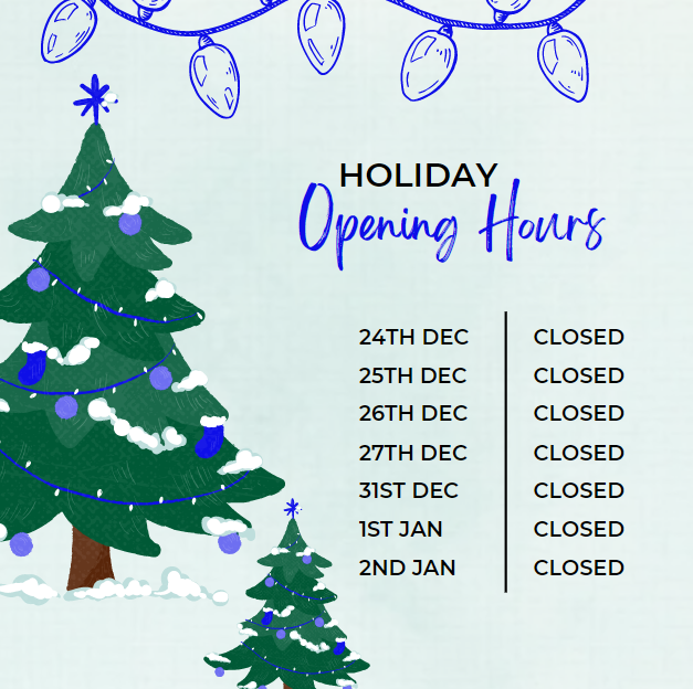 As the holiday’s fast approach, please take a moment to look at our opening hours during the festive season. 24th December – Closed 25th December – Closed 26th December –...